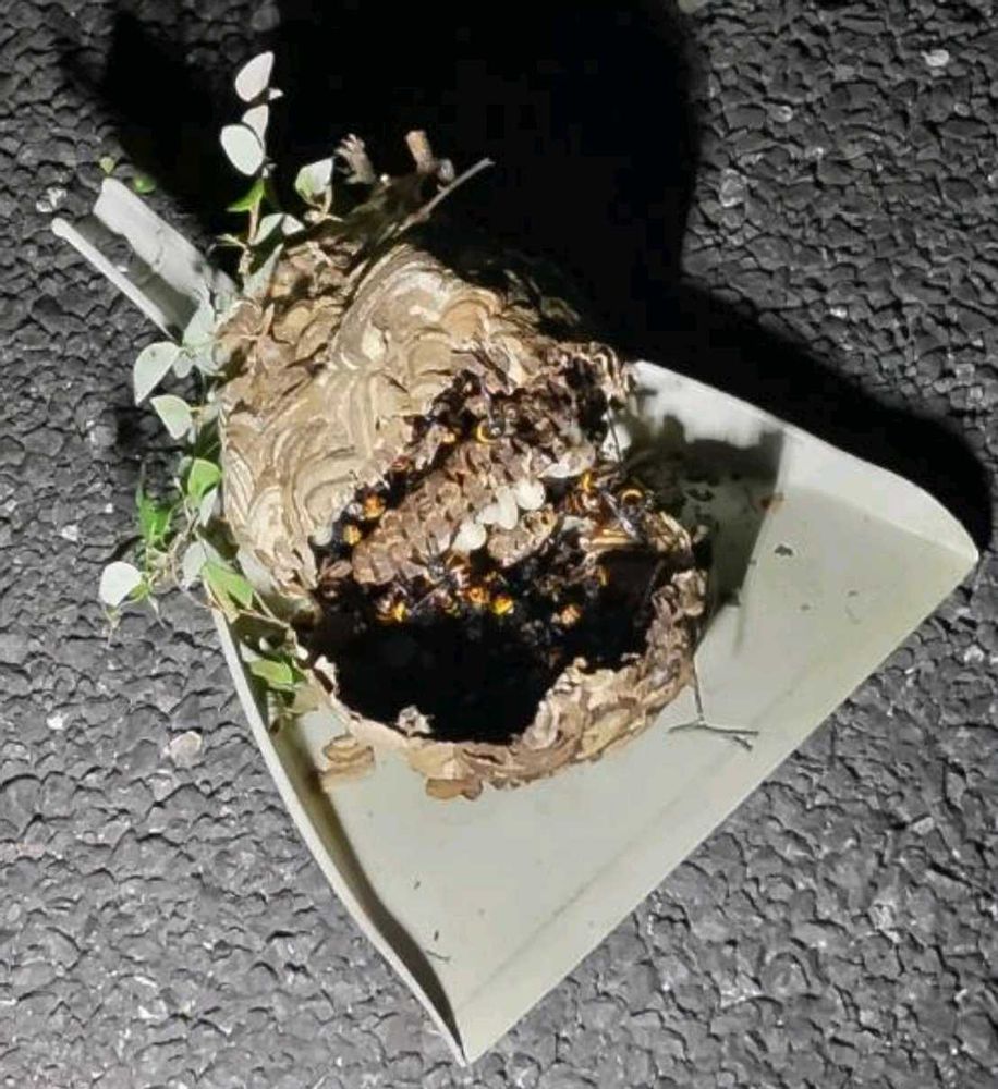数分置いて、枝ごと蜂の巣を取り出し、写真撮影し、ゴミ袋へ入れて……ものの10分程度で終了