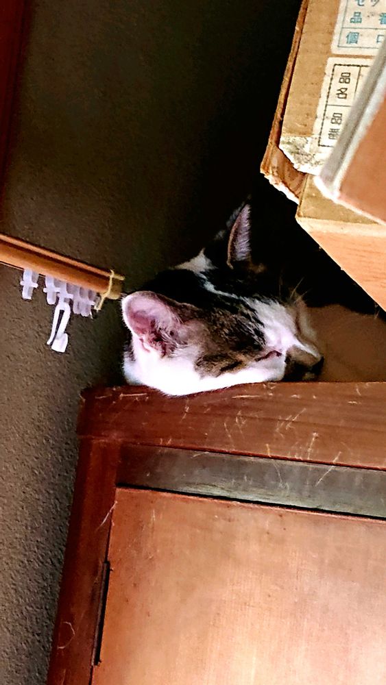 最初どこに寝てるか分からなくて、「チョビ〜?!」って呼んだら、タンスの上から「にゃ〜ん!」って鳴いてびっくりでした😂