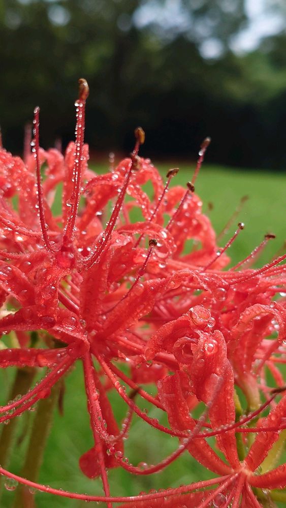 夏に広げた葉からも取り込んだ地中からたくましい茎を伸ばし花を咲かせる曼珠沙華 ピンと伸びたオシベ 赤い花びらには得も言われぬ気品が漂います🍁🍄🌾🍂🍁🍄🌾🍂