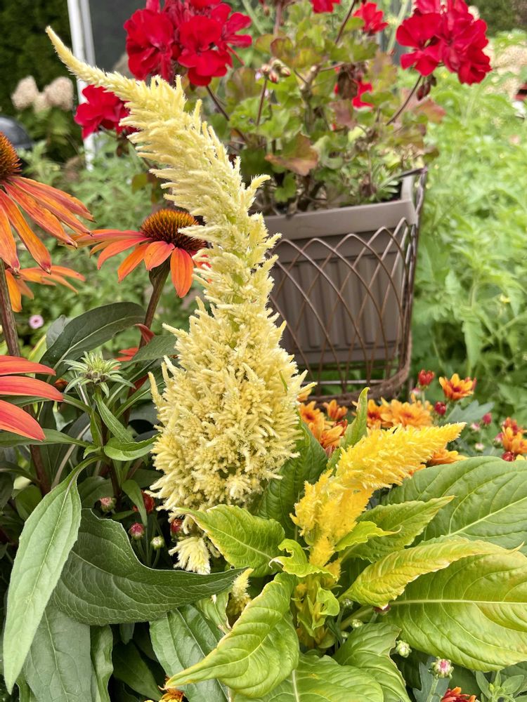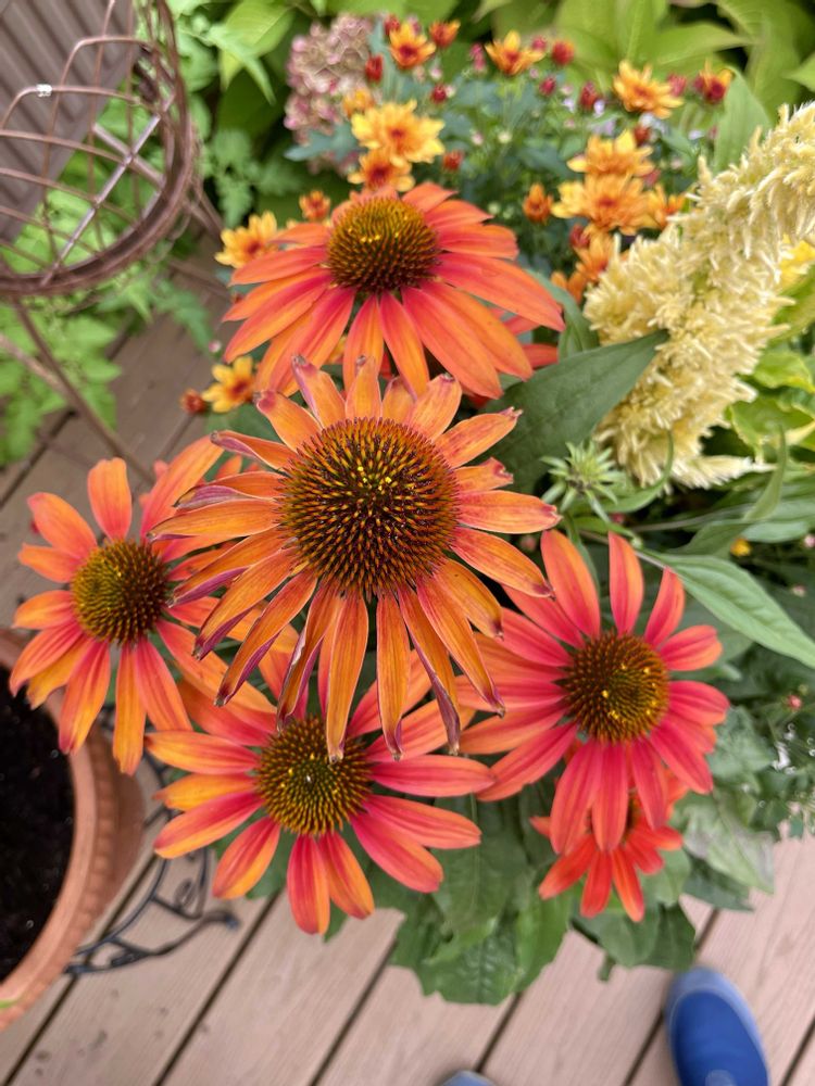 正面なのでケイトウが目立っているけれど、このオレンジのエキナシアも大きい株で、賑やか
