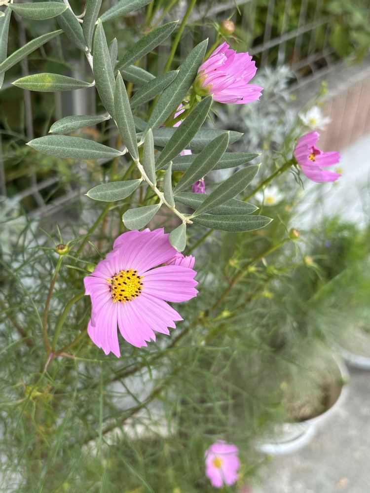 ④鉢に植えたコスモスが咲き始めましたがほとんどがうまく育たず寂しい感じです。