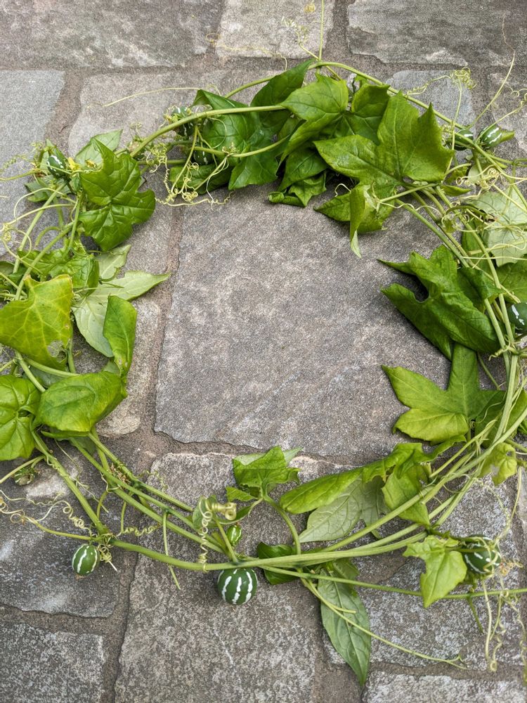 皆様の投稿で知ったスズメウリのリース✨、私も作ってみたくての挑戦だったのですが、あまり実が大きくなる気配がなく😅そのうち葉っぱは青虫🐛が食べ散らかし😨…思い切ってぜーんぶカット✂️しました🥴