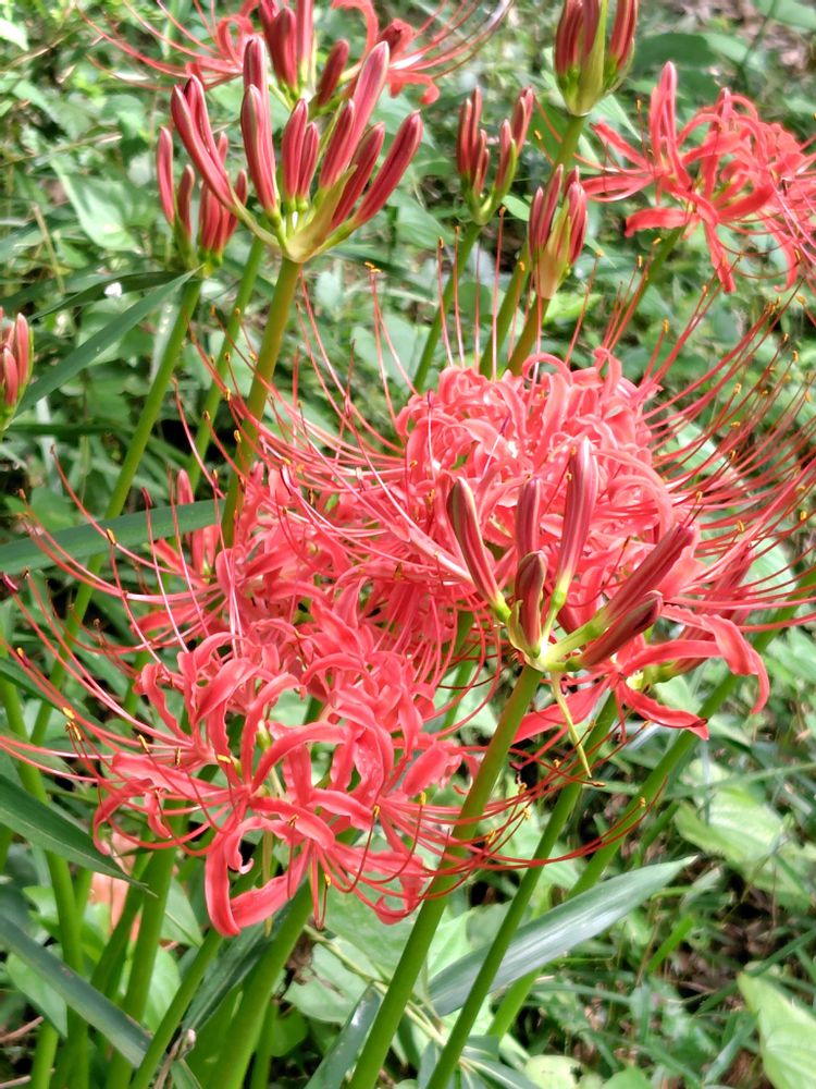 雑木林に咲き始めた彼岸花、開き切る前の蕾が可愛らしいです