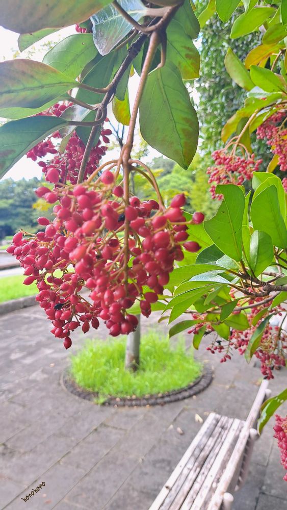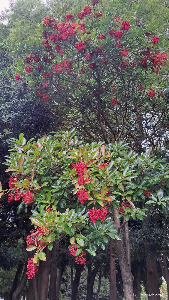 夏に咲く小さな白い花は見れませんでしたが、真っ赤な珊瑚みたいな果実が沢山生っていました。熟すと黒くなります。