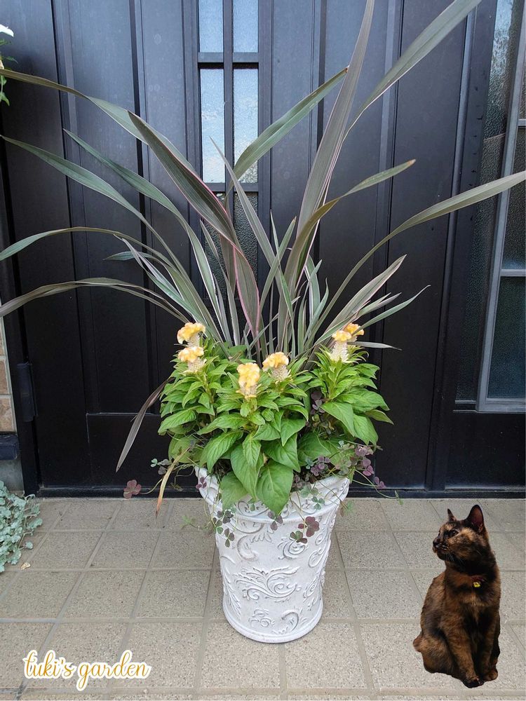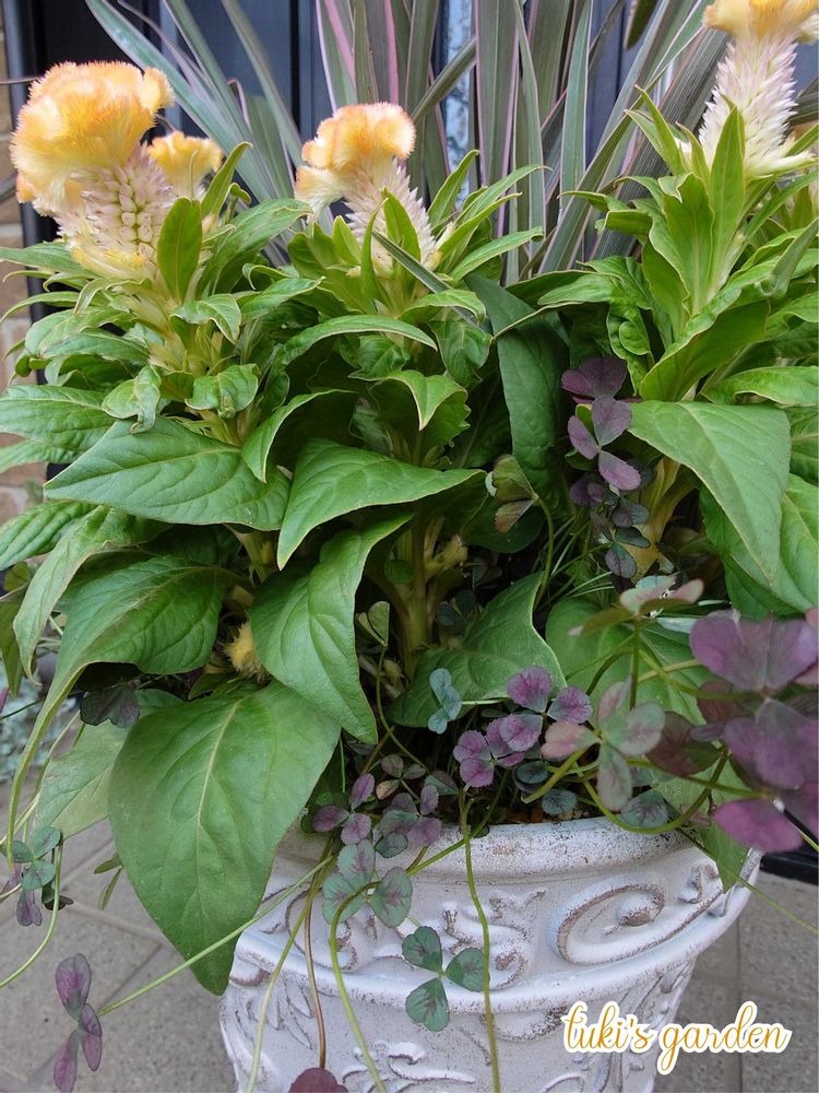 大好きなセロシア『ジュラサーモン』と秋色のクローバー☘️『ウィリアム』に、我が家で巨大化したニューサイラン『ピンクストライプ』を合わせて、さび猫っぽい雰囲気を出してみました😸
