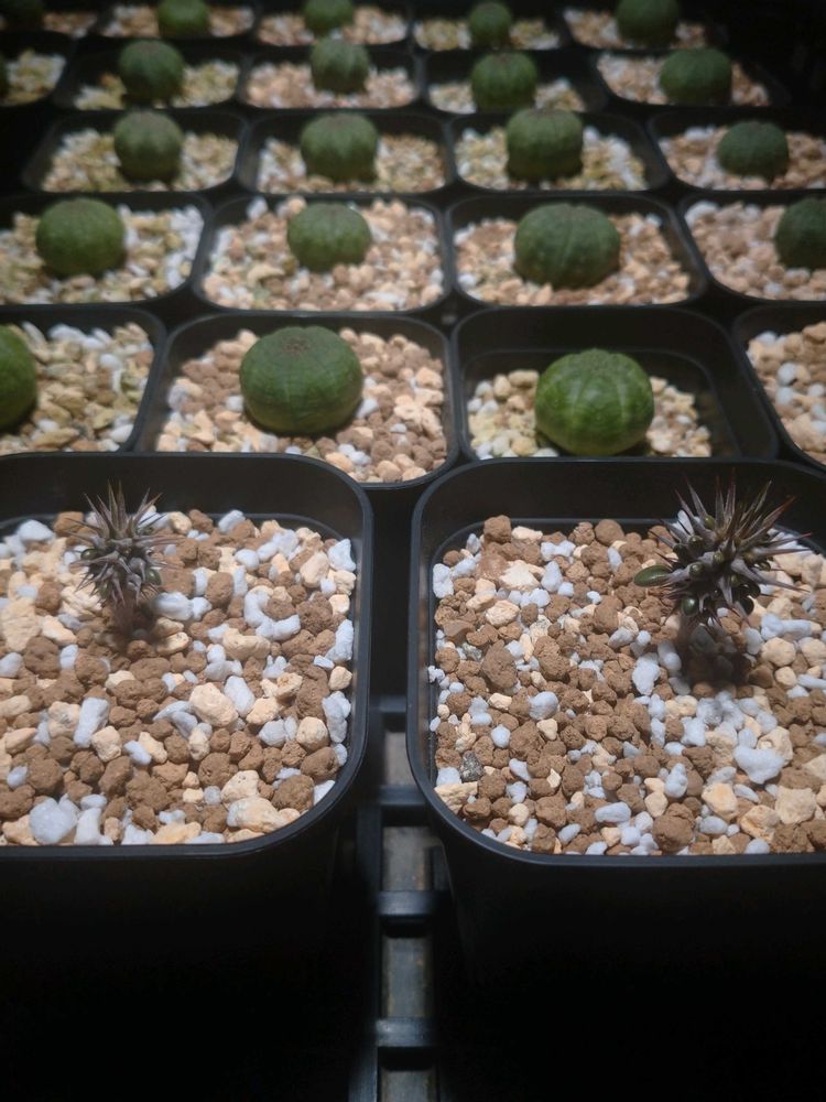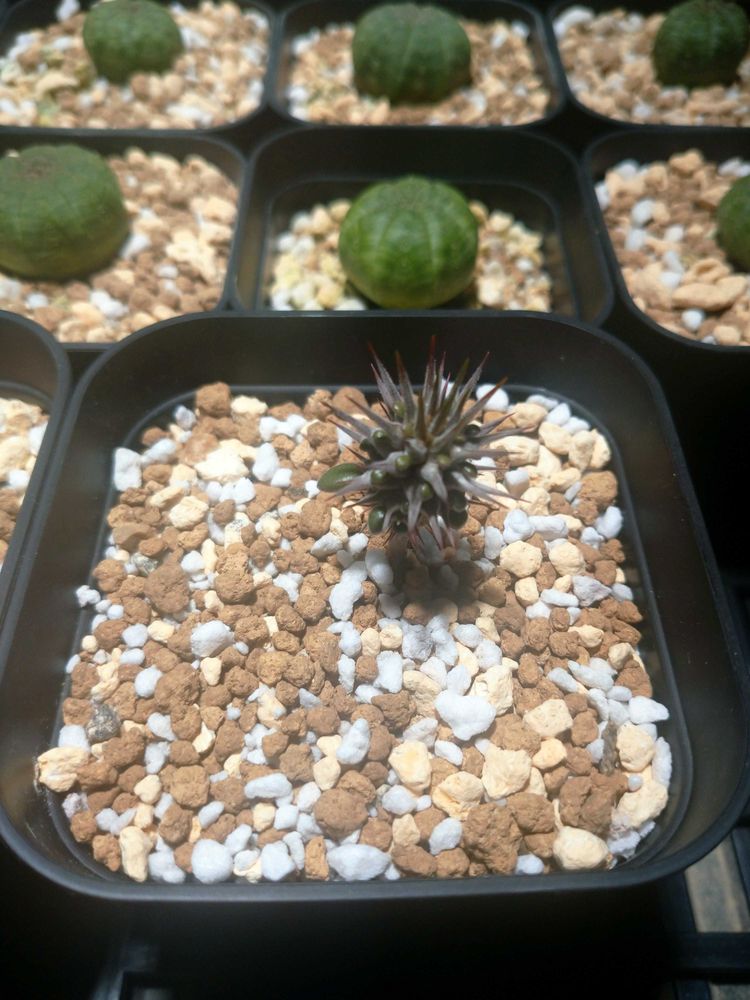 実生7ヶ月株です。初めてで適正な成長速度が分からないのですが、ゆっくりなようです。トゲと葉が徐々にそれらしくなってきたので、今後が楽しみです。