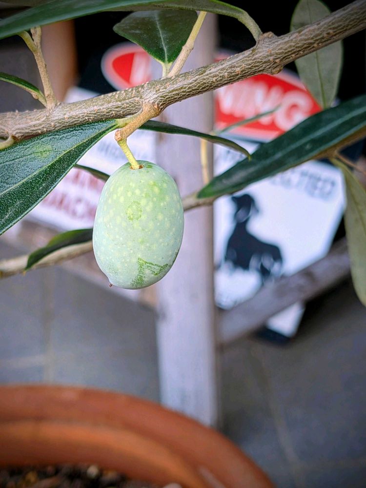 小さな苗を鉢に植えて 我が家の玄関で2年目を迎えるオリーブ 初めて1つ実がなりました(^^)