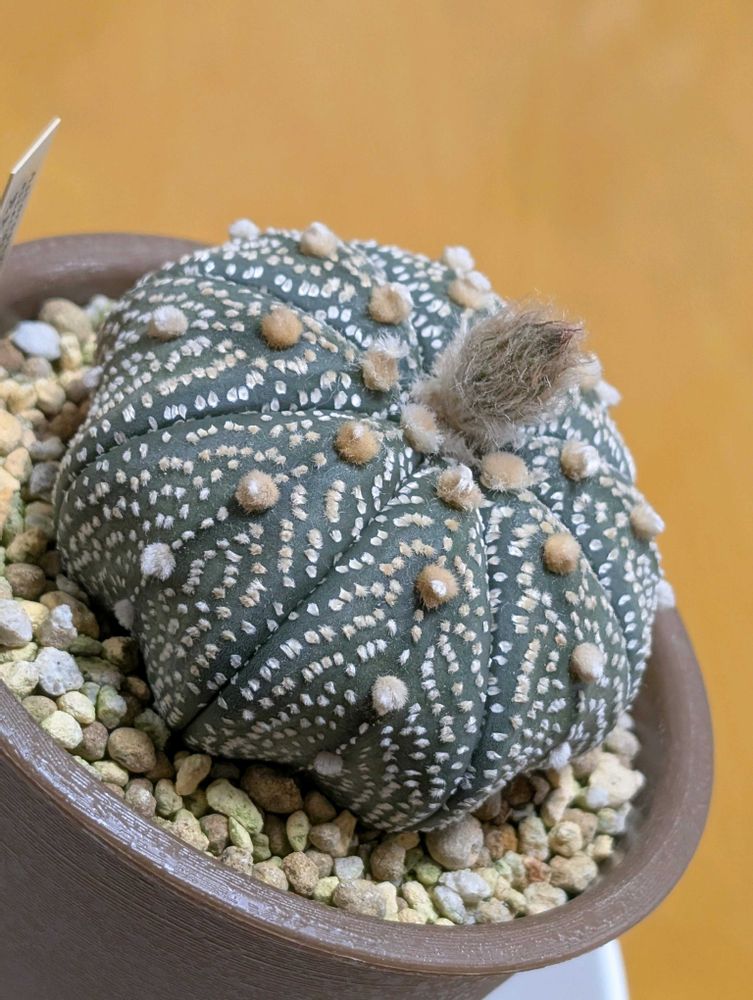 今日は、アストロフィツム属の兜丸です。こちらも銀冠玉と同じスパンで花芽が上がっています。兜丸の開花は短いよう?で一度しか見れていません。棘のないサボテンは植え替えが楽で良いですよね。毛もカワイイですし、模様もなんともいえないです。小型の兜丸もいたのですが、2体揃って冬の休眠で激萎みしまして、こちらの大きい方は何とか膨らんで助かったのですが、小さい方はシボシボのまま回復しませんでした。黒くはなっていないのでワンチャン水耕で発根できないかなぁと企んでいますが…難しいでしょうね汗