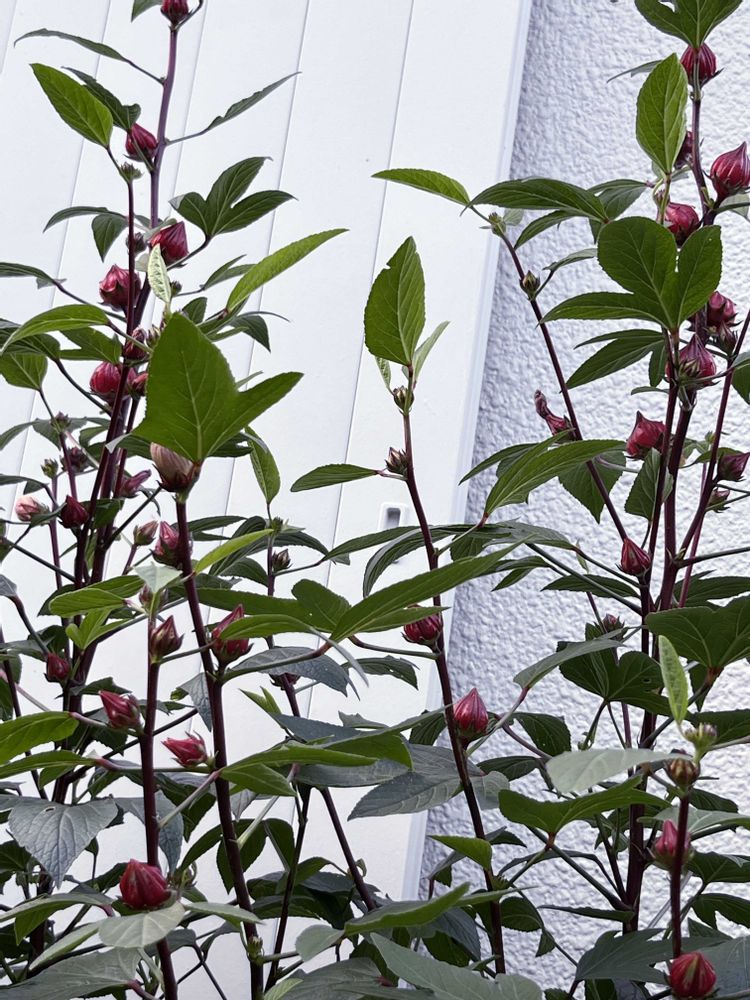 ローゼルの種を4月末に蒔いて、やーっと花が咲きました。花は白くてあっという間にしぼみ、このきれいな赤い実が残ります。ローズヒップと同じようにお茶にできるらしいです😱🩷💓