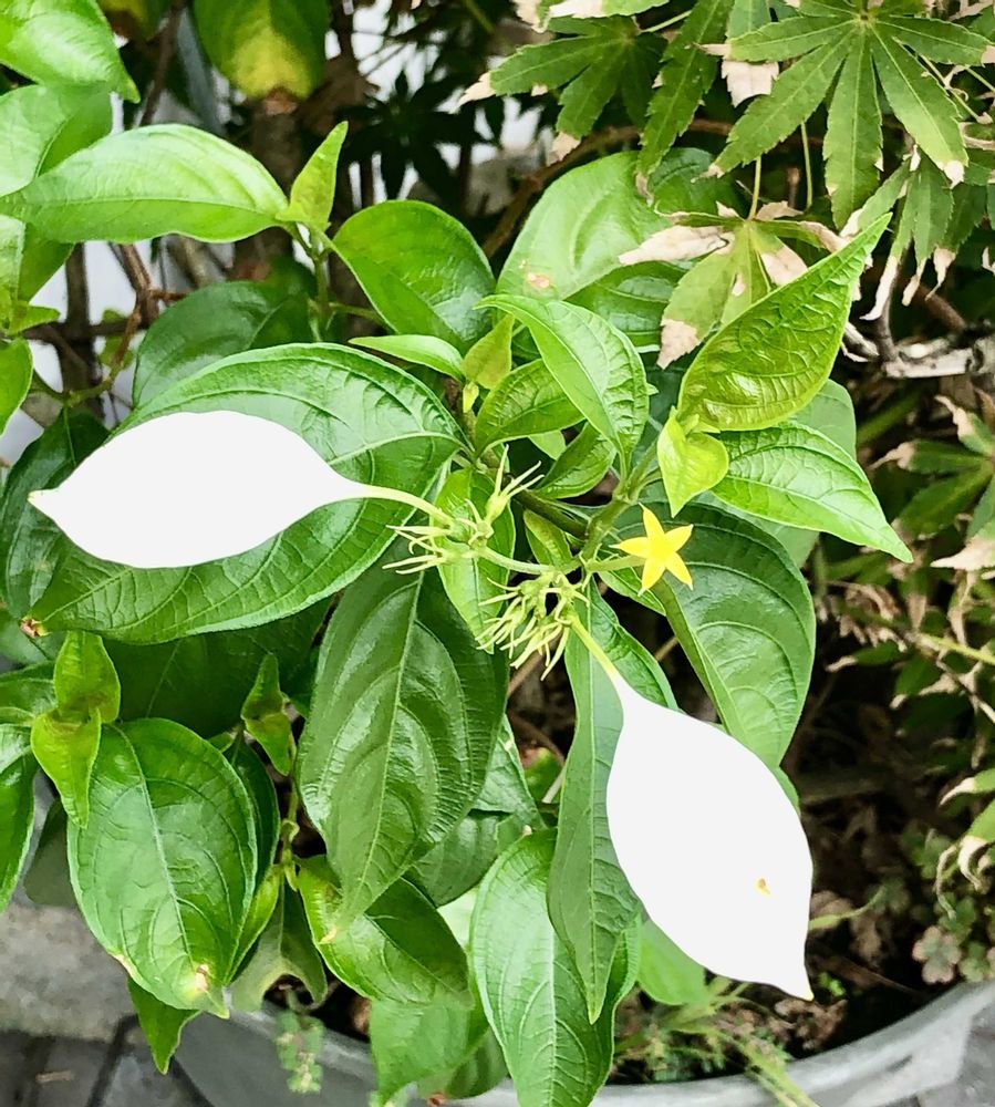 ※初めて見る花、調べてみると『コンロンカ』という名前。(別名→ムッサエンダ、ハンカチの花)。