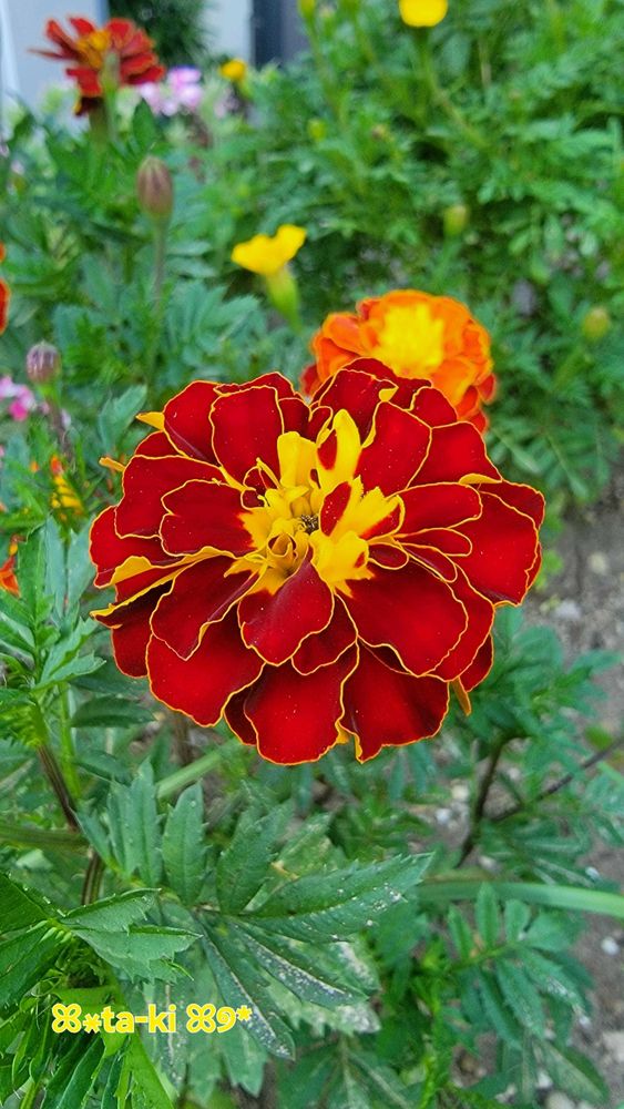 オレンジ🧡色のマリーゴールド(苗から) 一株ですが大きく育ち 隣のランタナ🟡と混じり合ってます😅