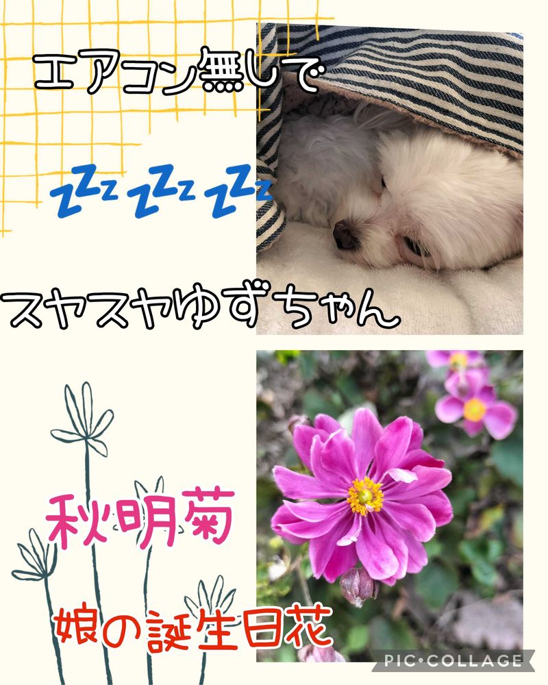 二度寝してるゆずちゃんと娘の誕生日花💕秋明菊