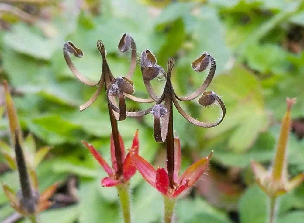 今度こそは赤花ゲンノショウコかと思うのですが いかがでしょうか 林間の散策路の真ん中に 人に踏まれることもなく可憐な花を咲かせていました この写真を撮ったのが9月7日ですが 2、3枚目を撮った9月23日には 葉が鮮やかに紅葉(草紅葉)し 細長い形をした蒴果と すでに種子を弾き飛ばした後でしょうか 果皮が下から5つに裂開して反り返った姿が造形的な美しさを湛えていました さすがに秋の訪れを感じさせます