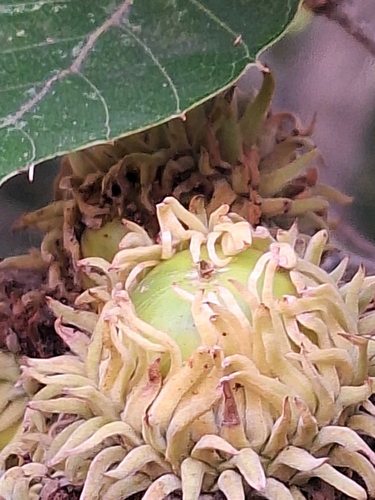クヌギのドングリは、直径が広く浅い殻斗に覆われ、果実の多くが露出しているのが特徴です。