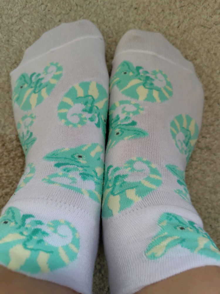 カメレオンの靴下、息子がいいなーって言ってたから履かせたら、履き心地が女子っぽくて諦めてた🤣🤣🤣