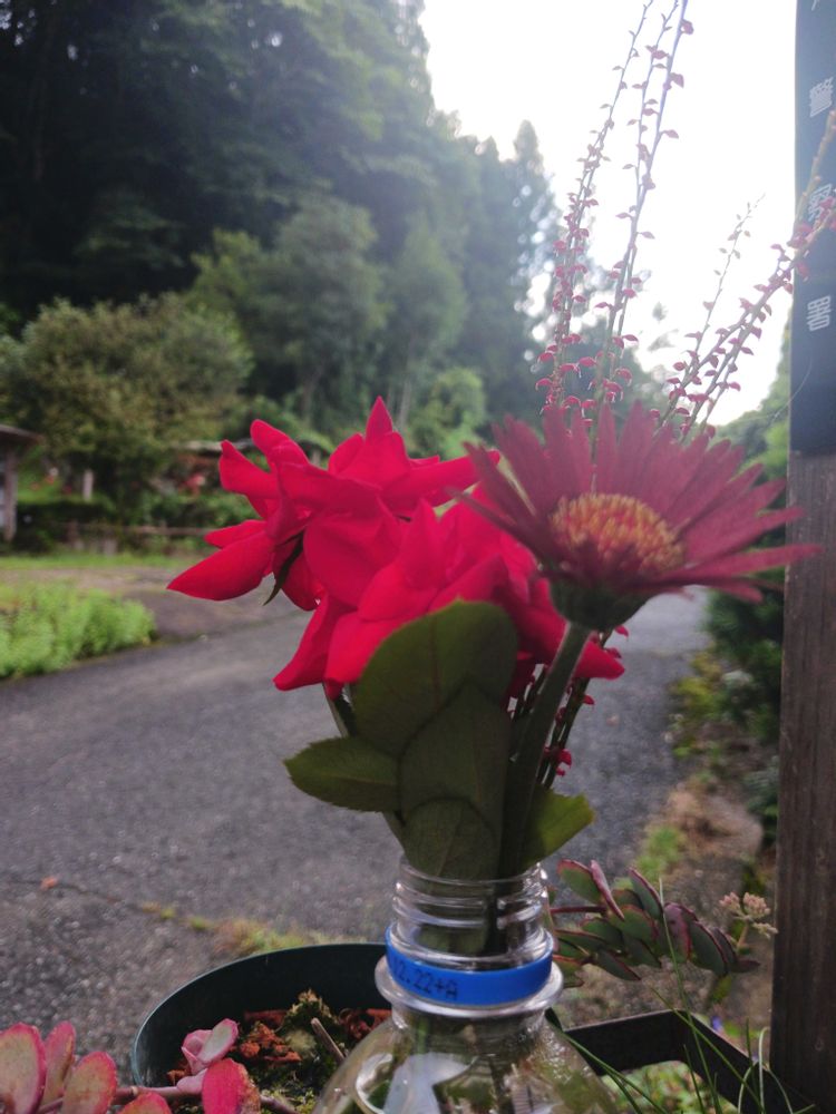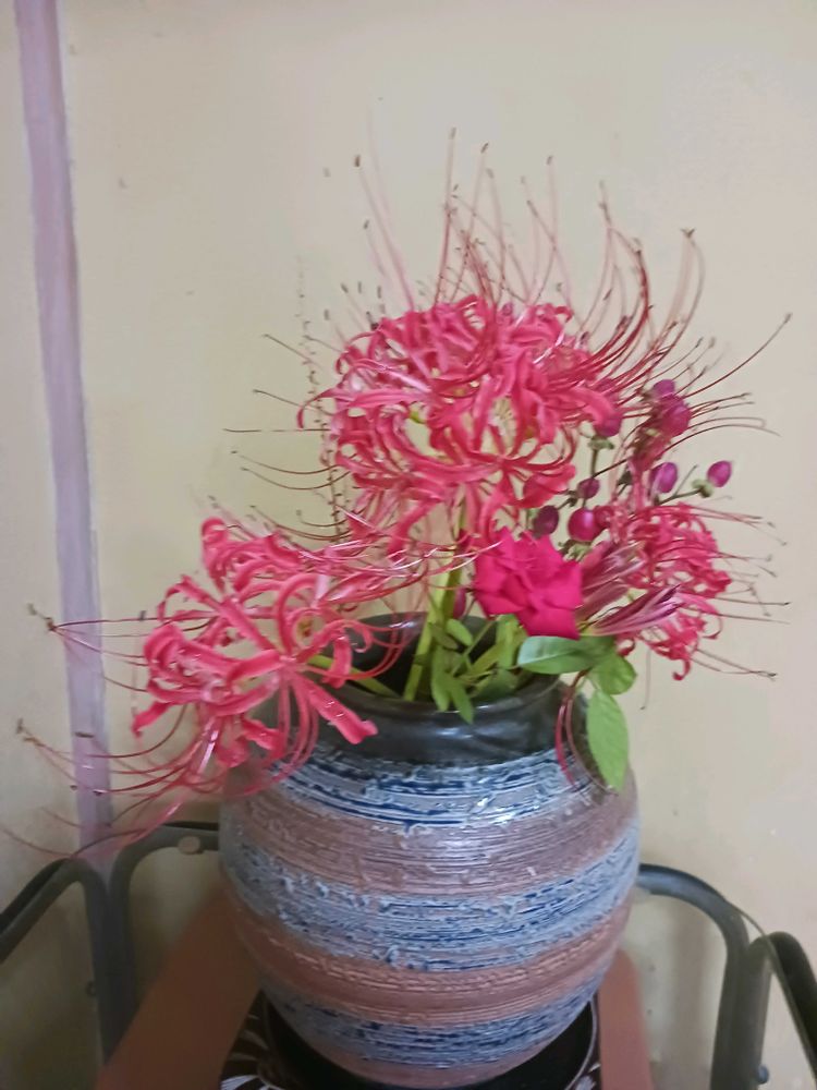 ①ちょっと前に買って玄関に飾っていたお花は早々に萎れて飾るお花がなく寂しい玄関でしたが今朝18日くらいから彼岸花が田畑や色んな所に元気に咲いているのでカットして来て飾りました。②は外に最近又咲き始めた薔薇をペットボトルに入れて飾っていたのですがイオンのトイレに飾られたお花の中にミズヒキがあったので我が家もこぼれ種からのが沢山あるので真似をして足してみました。
