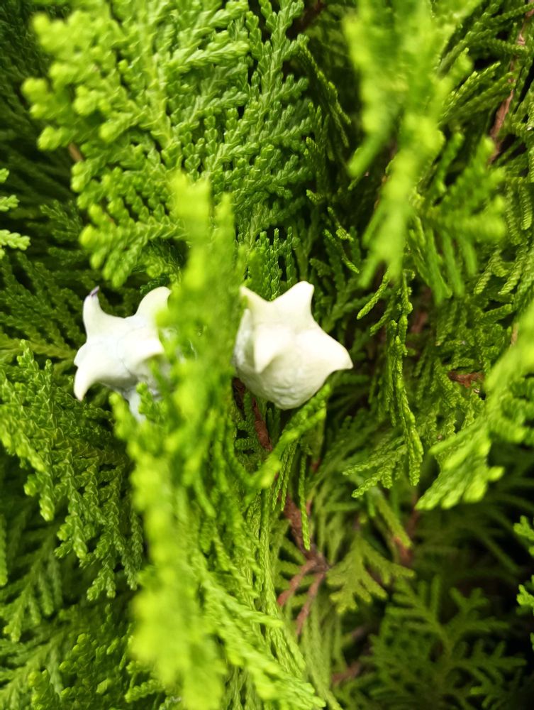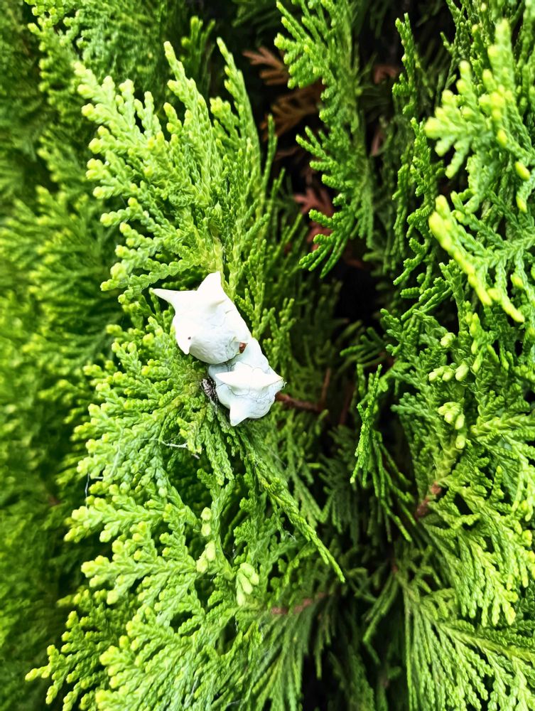 緑のカシワに「金平糖」の様な真っ白い実がとても目立ってました。秋に熟し、茶色く裂けて種子が出るようです。💚🤍