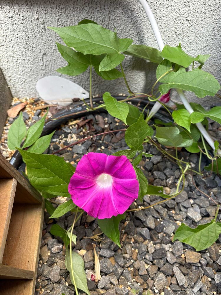室外機と植物ラックの間の本当ーーに目立たないすみで、朝顔が咲いていてびっくりしました。