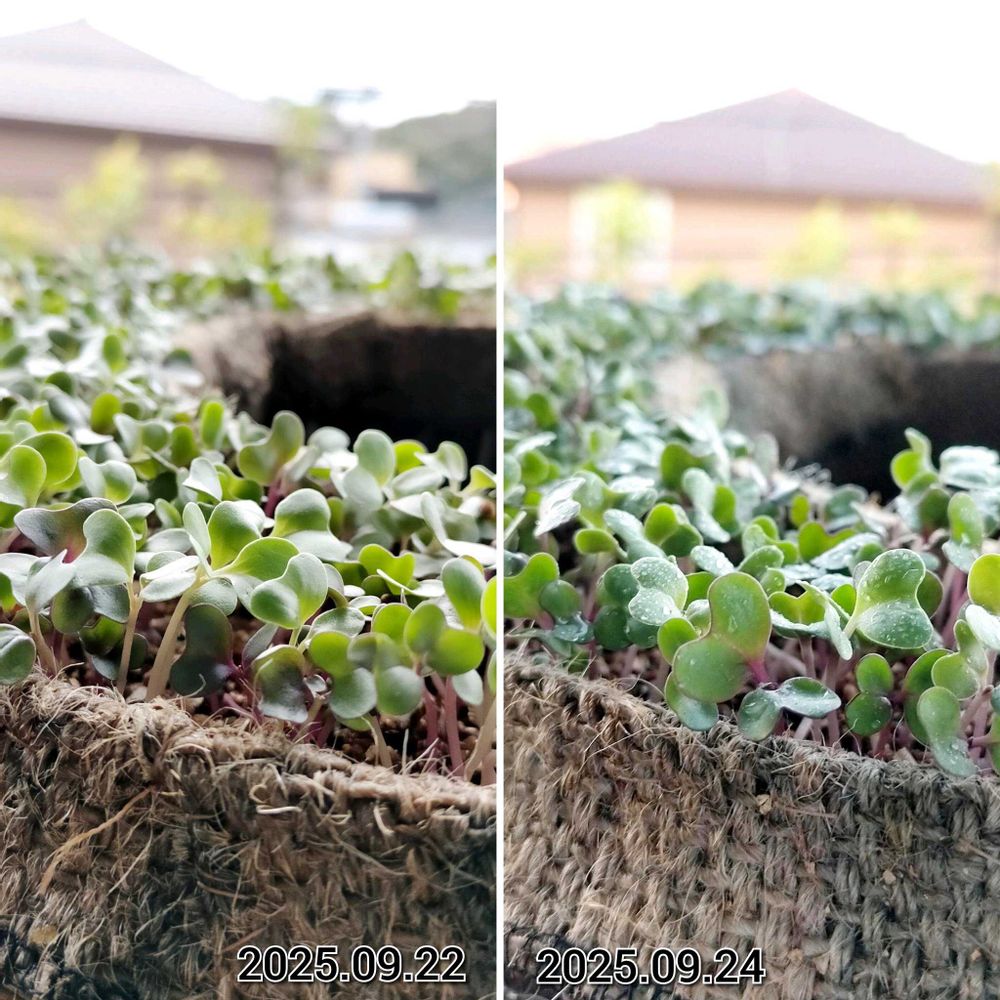 【1枚目】直播き葉牡丹リースは何とか徒長せずに保てています。9月16日種まきから9日目。