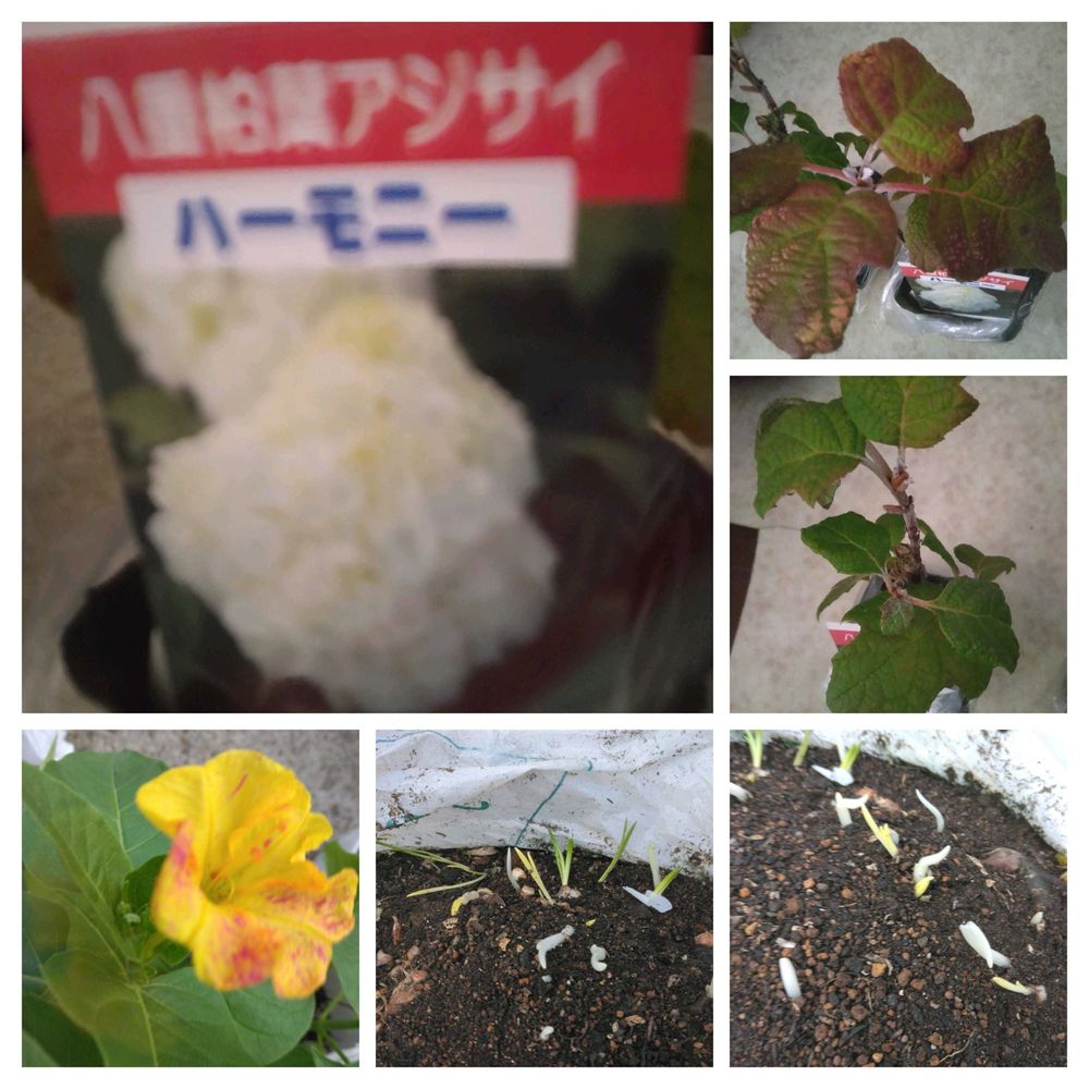お取り寄せした八重柏葉紫陽花ハーモニーの🏷とイメージ写真と苗木