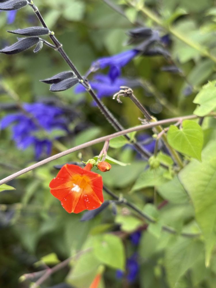 紫色のメドセージの中で咲く朱色のお花が目を引きました❤️