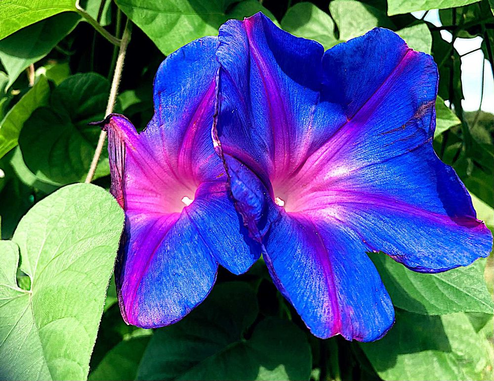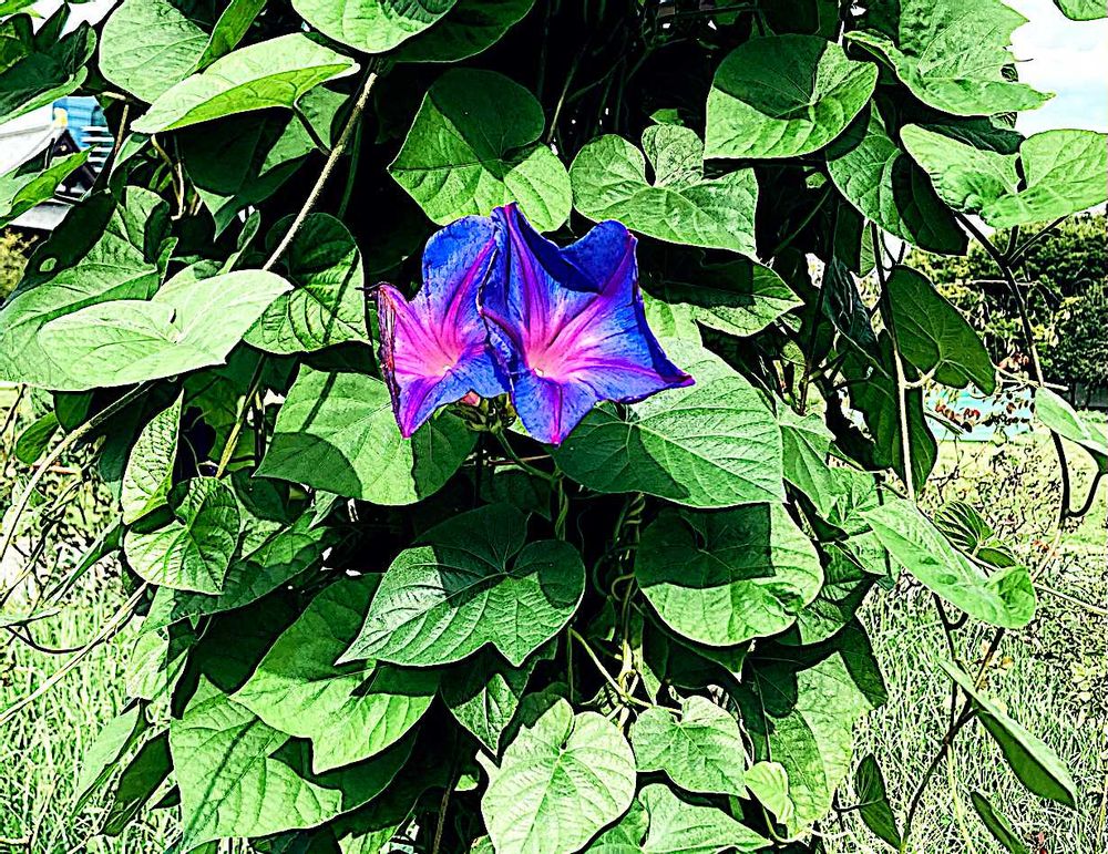 公園の原っぱに忽然と、見上げる程に草丈高く生長した朝顔の蔓が塔のように現れて、二輪だけ、ピッタリ寄り添うように咲いていました😃