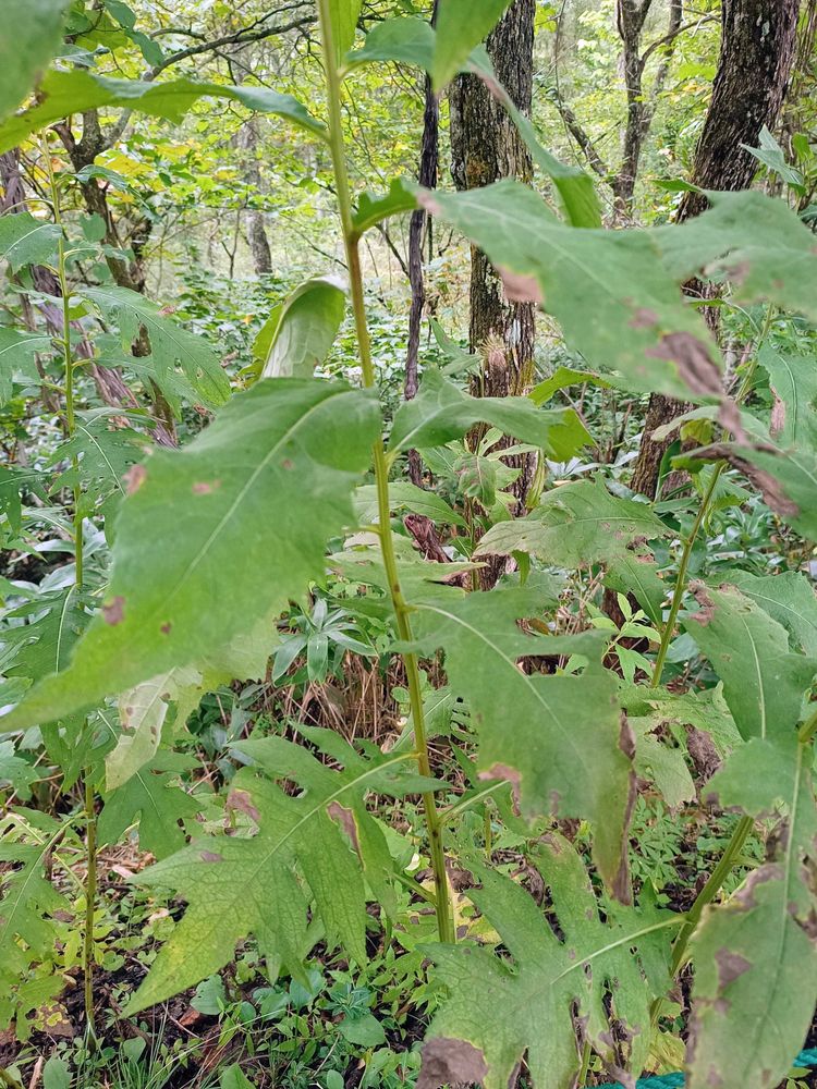 丈は1-2m、時にそれ以上、茎葉は20-30cmの楕円状披針形で、全縁~欠刻状の歯牙~羽状中裂とバリエーションがあります。