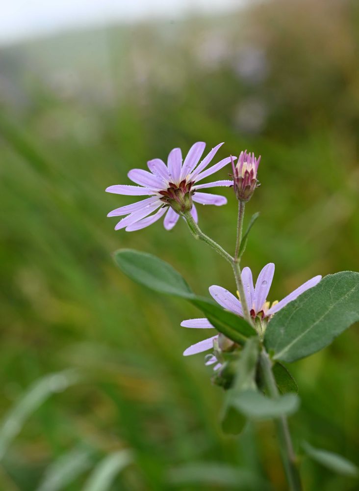 茎の先端の花序は散房状で、頭花は直径2.5 cmほど、周辺の舌状花は細長くて紫を帯びた白から薄紫、中央の管状花は黄色。