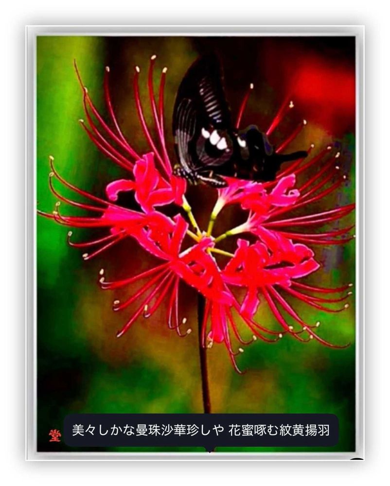 ;とても綺麗な曼珠沙華の花に、黒い紋黄アゲハ蝶が花蜜を啄んでいました。