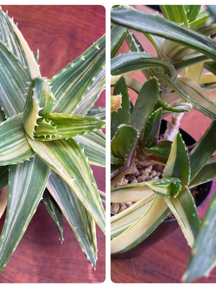 アロエ不夜城✨錦✨ぐんぐん成長⤴️頭が重くて鉢がグラグラに🫨今週末には植え替えしなきゃですね…➡️真上からのpicと株元のpicを並べてみました