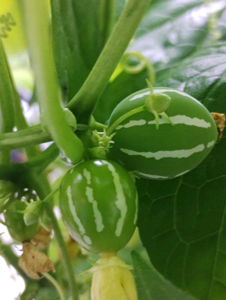 ゴーヤとかと違って一か所に複数の花が咲くので三つ子とか四つ子とかのウリ坊兄弟になるのですよ〜😆