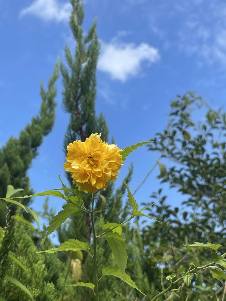 青空に八重咲きの山吹が映えて綺麗〜💓