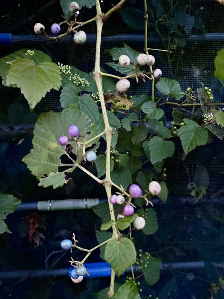 ここは、大きなイチョウの木の下で、畑の柵に巾3mぐらいに渡り、野葡萄がたくさん垂れ下がっています。少し歩くと、もう1箇所あって、ここも小さな緑色の実が、いっぱい付いています。