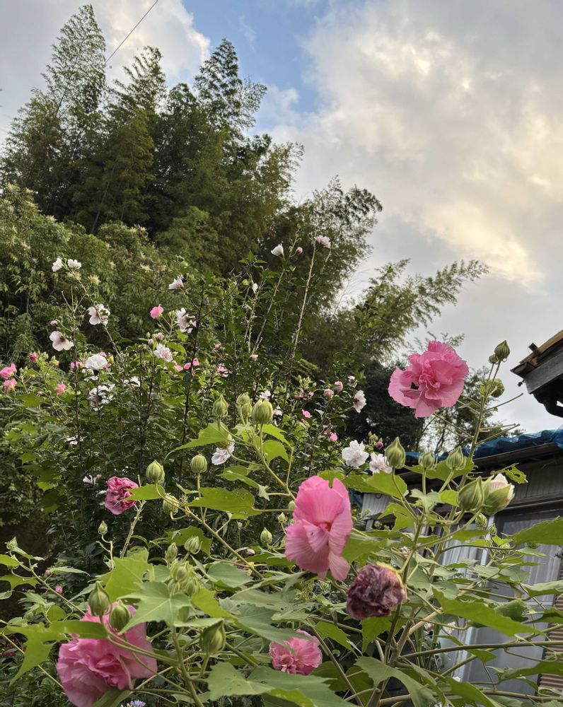 色づく時╰(*´︶`*)╯♡。🩷🌸🩷八重、一重、ムクゲがお迎えしてくれる。車🚙〜。泣き出しそうな空を見て慌てて撮りました。😅💦