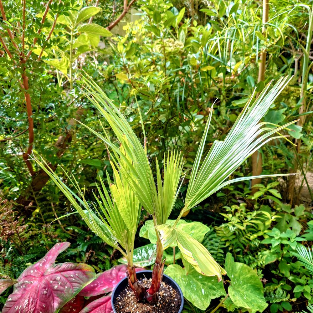 ワシントンヤシの学名は、Washingtonia filifera、ただし、一般的に「ワシントンヤシ」として流通しているものには、近縁種のWashingtonia robusta(ワシントンヤシモドキ)、またはその交配種も含まれるそうな。