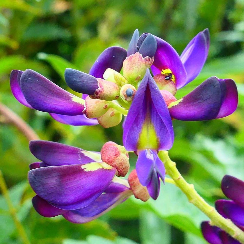 夏に茎先や葉腋から円錐花序を伸ばし、赤紫色で蝶形の花を咲かせる。