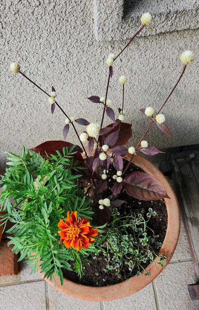 赤葉千日紅、マリーゴールド、クローバティントショコラの深みのある秋🌸