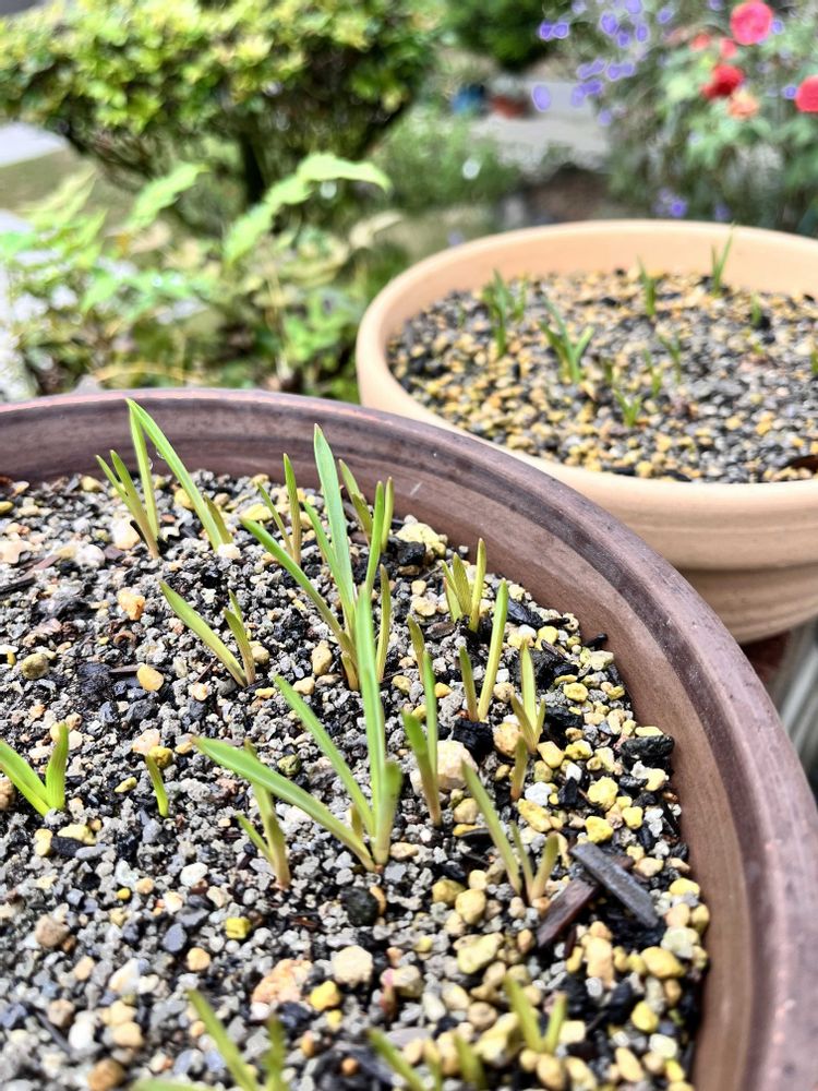 秋雨浴びて鉢に植えっぱなしのムスカリが発芽してしまった🌱🌱🌱