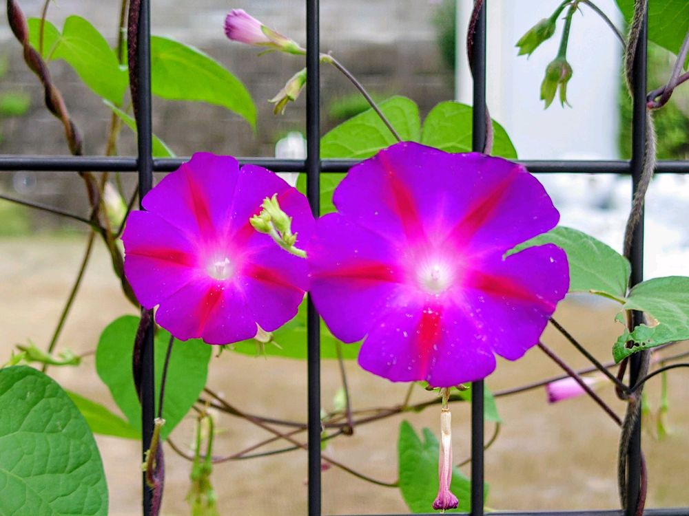 今日の昼休み、散歩途中に見かけた紫色の朝顔。
