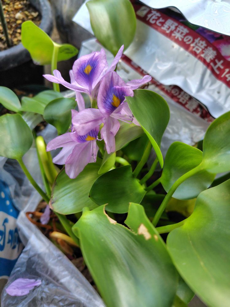 ① 昨日捨てようとレジ袋に詰め込んだ「ホテイアオイ」。今朝見たら花が咲いていました。☺夕方ゴミ袋に移しました。🥲
