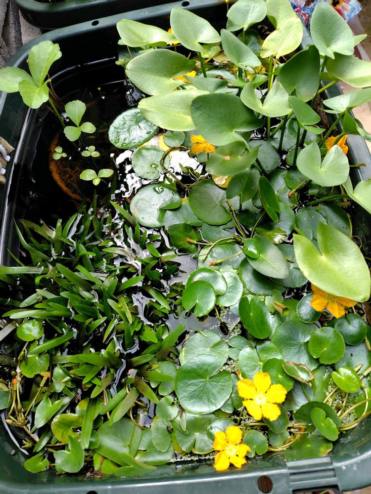 ② アサザ、コウホネ、ナガバオモダカが入っているメダカ容器。アサザはまだまだ咲いています。☺