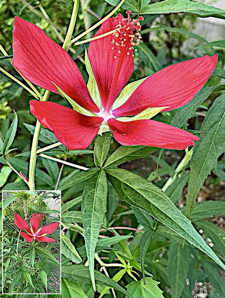 モミジアオイ(紅葉葵),/長い ‘シベ’ 筒状合着5裂して、 圧倒するや背高真っ赤な5弁花/の投稿画像