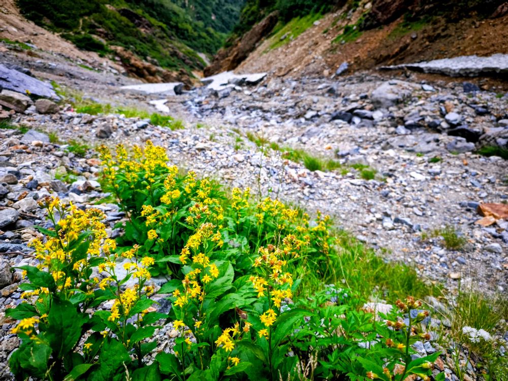 5枚目:下山方向に雪渓☃が見えます ※手前の花はミヤマアキノキリンソウです
