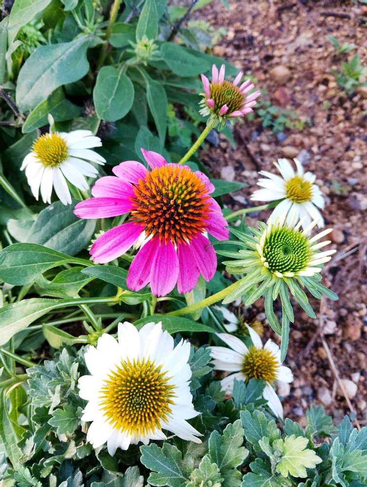 公園の花壇のエキナセアまだがんばつてます。💛🩷♥️💛🩷♥️