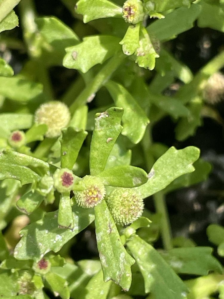 総苞片は長楕円形で全て同じ長さ。頭花に舌状花はなく、筒状花も花冠はほとんど目立たず、緑の丸い塊としか見えない。
