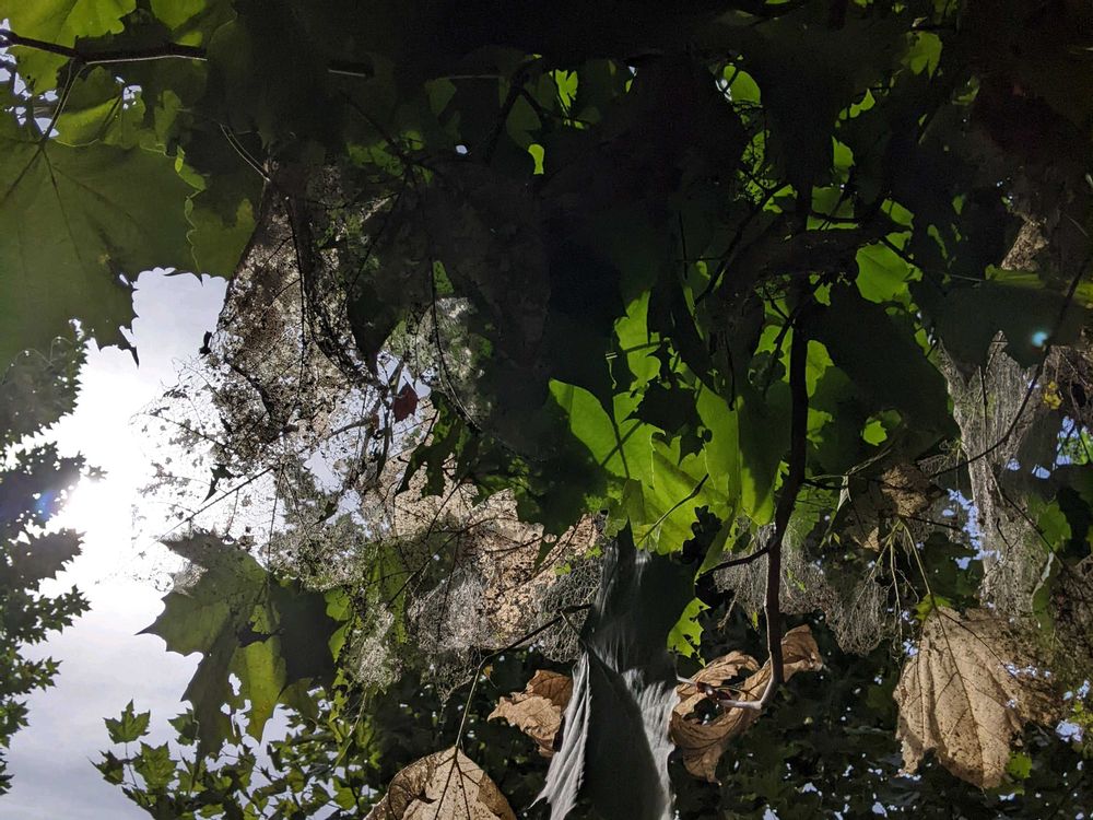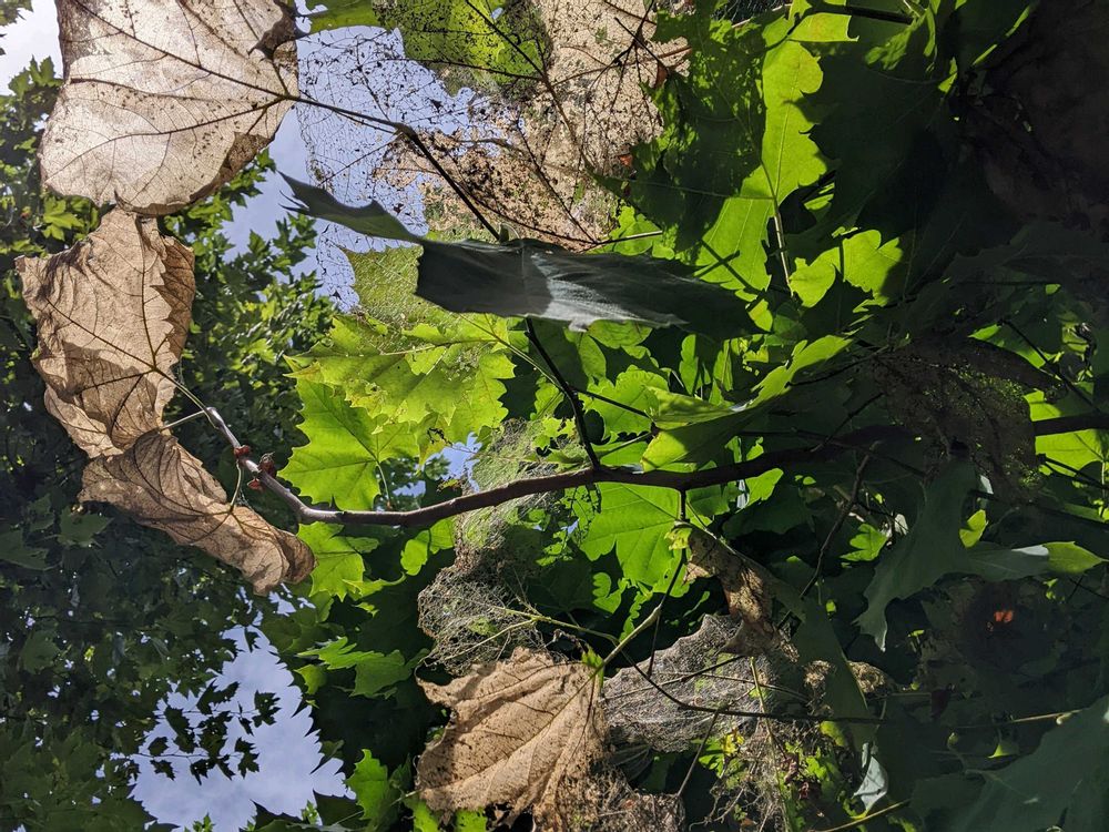 新宿御苑のプラタナス並木のベンチで昼ごはんを食べていたら、枝についたまま朽ちて、葉脈だけになっている枯葉を見つけました。