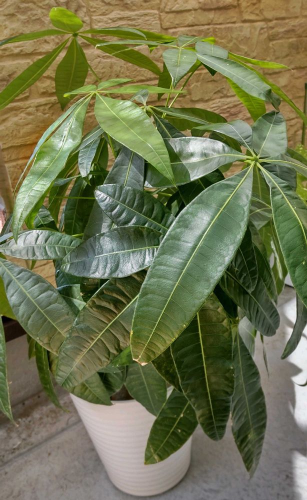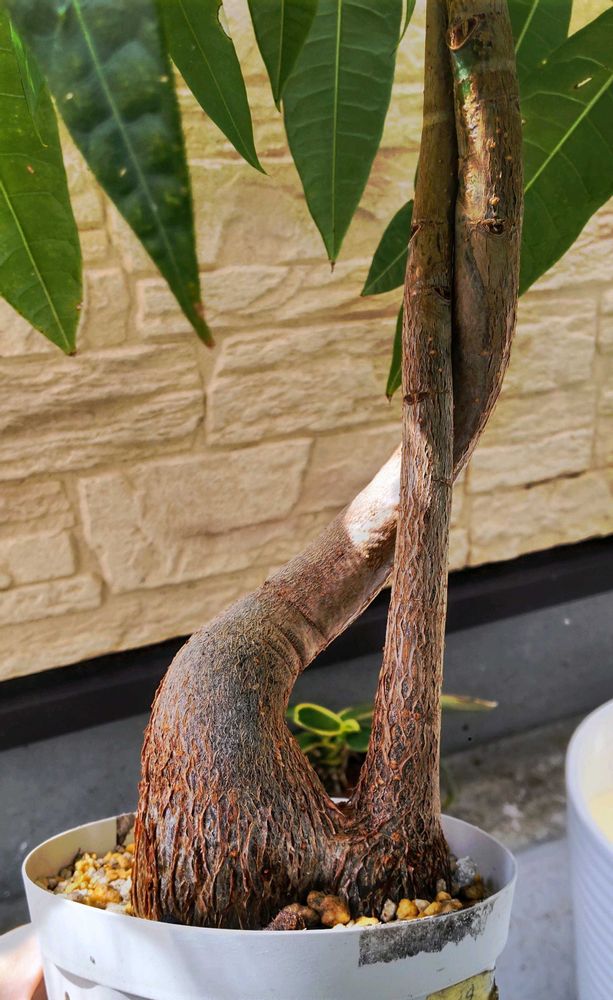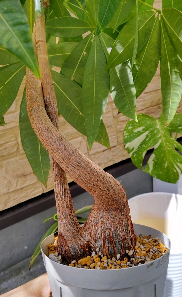 24年3月のパキラが太りました😃完全に2つ合体してる😚鉢カバーに入れないとバランス悪くすぐ倒れるのよね。来年あたり鉢を大きくするかな。