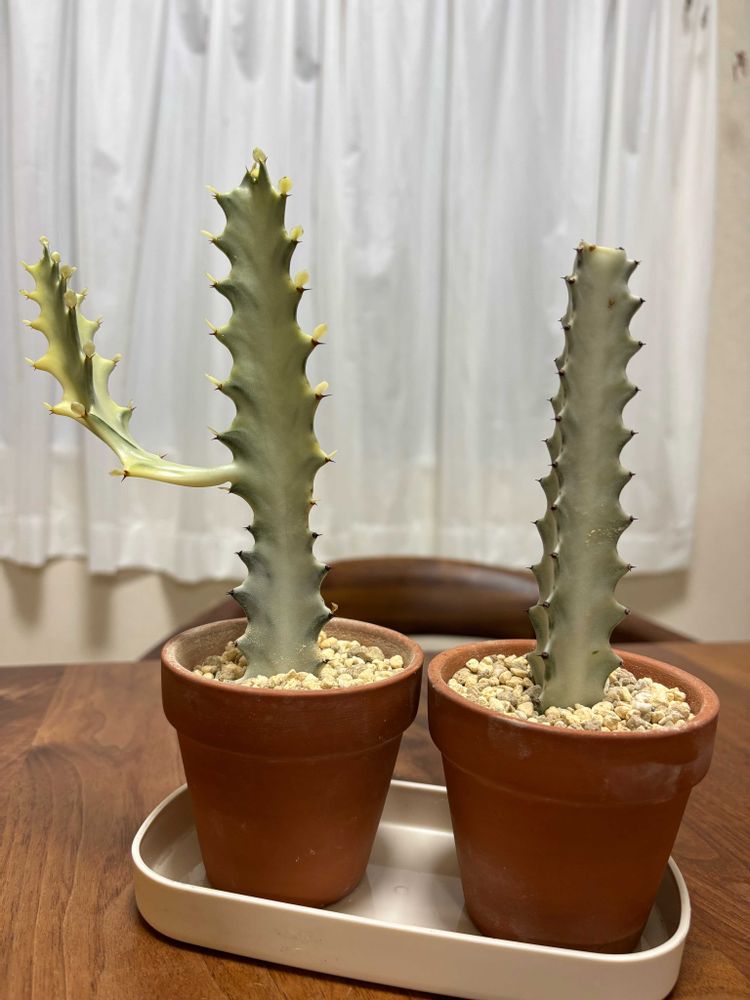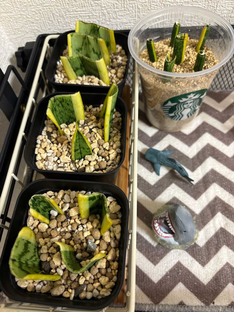 この間ちょん切ったホワイトゴーストとサンスベリアを挿してみました。しばらく水はあげないで様子を見てみよう。さぁ成功なるか!?