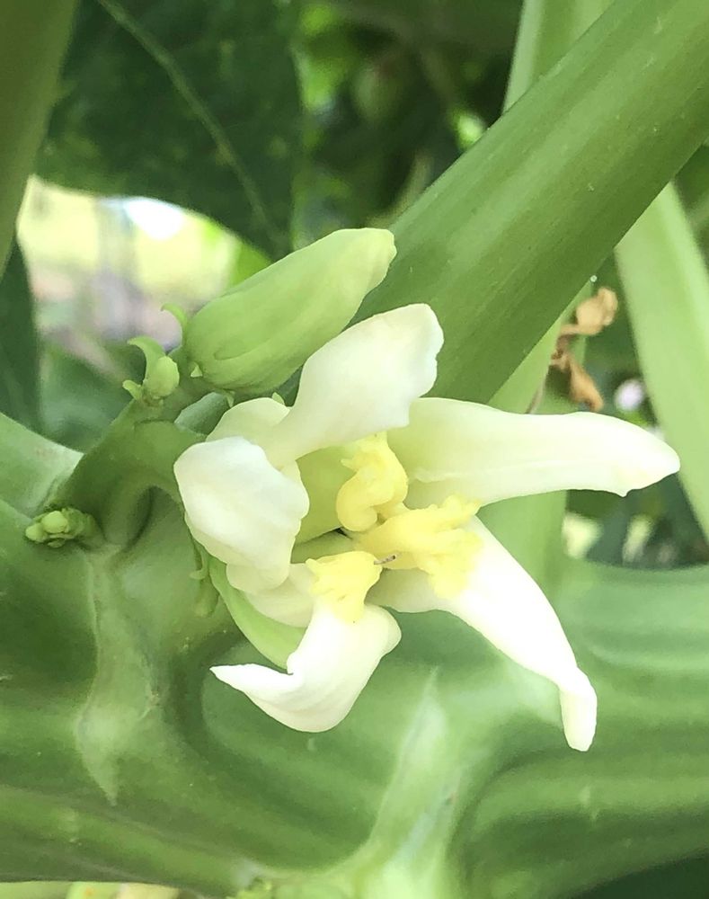 おはようございます。散歩道の近大薬用植物園でパパイアのお花が咲いていました。大きな実がなるのかな。