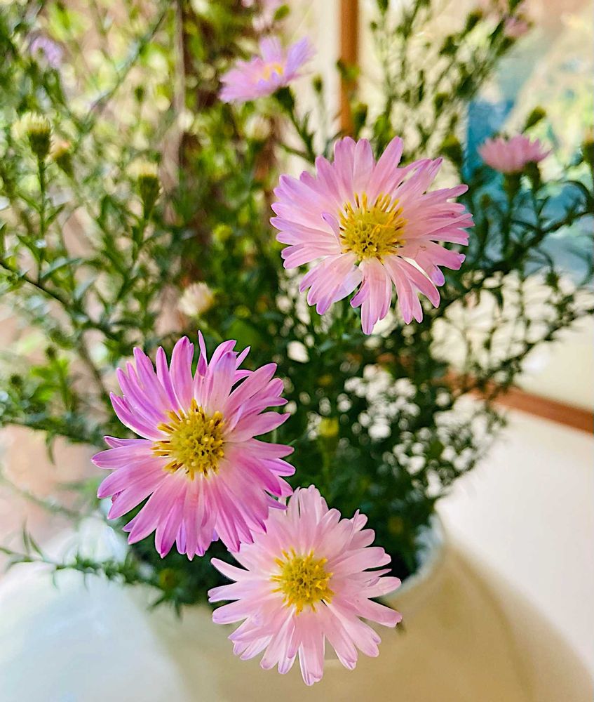 窓越しの柔らかな西陽を受けながら、優しい雰囲気で咲いていた「友禅菊(ユウゼンギク)」で、おはようございます✨🌸☺️🌸✨